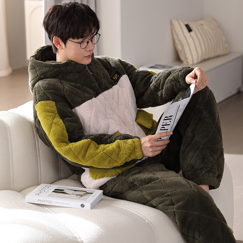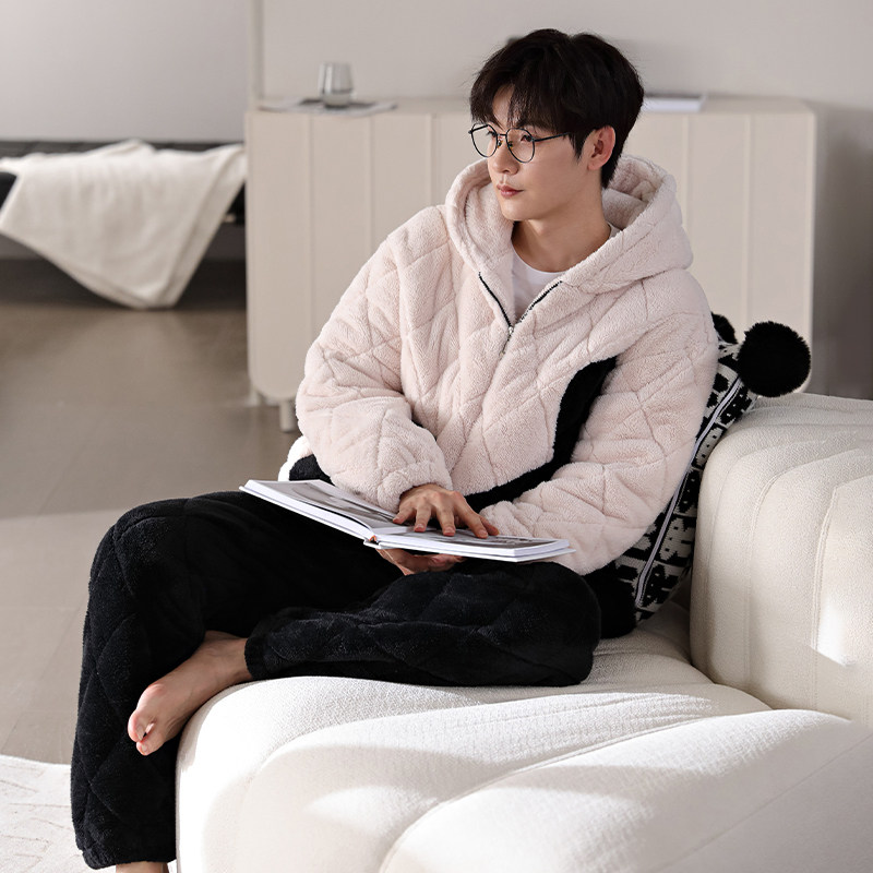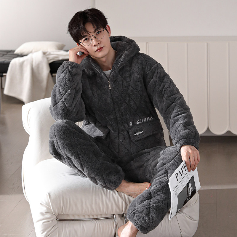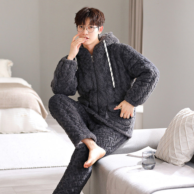 婷美珊瑚绒睡衣男秋冬季三层加厚夹棉连帽两件套宽松可外穿家居服