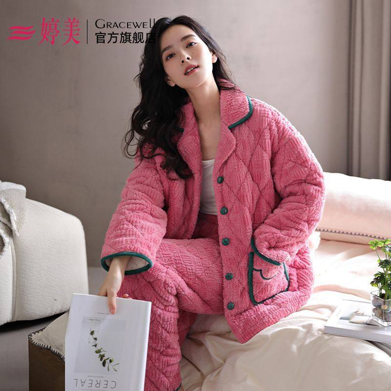 婷美新款保暖睡衣女秋冬三层加绒加厚珊瑚绒夹棉袄冬季家居服套装