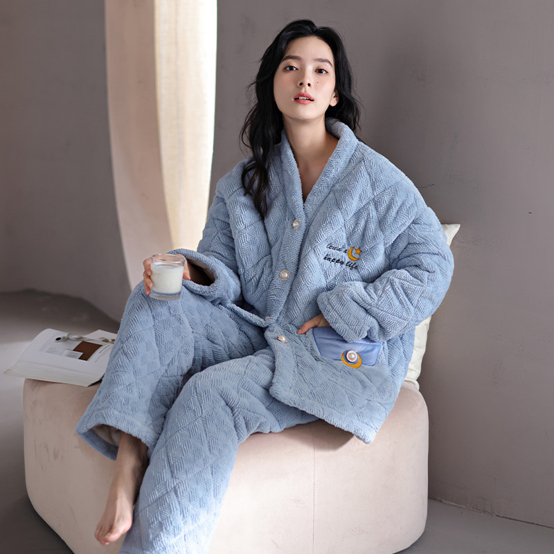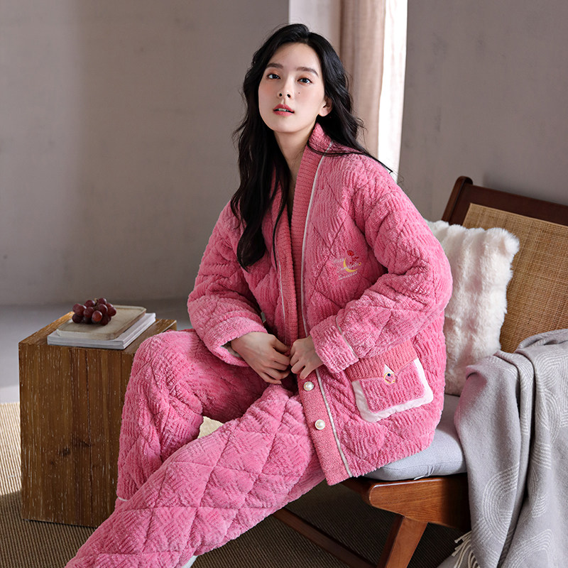 婷美珊瑚绒睡衣女冬天开衫三层夹棉加绒加厚秋冬季家居服女士套装