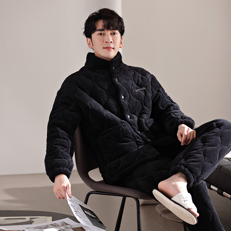 婷美黑色睡衣男士冬季珊瑚绒加绒加厚保暖三层夹棉袄秋冬天家居服