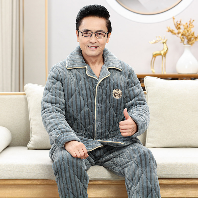 婷美中老年睡衣男士三层夹棉冬季珊瑚绒加厚加绒保暖家居服两件套