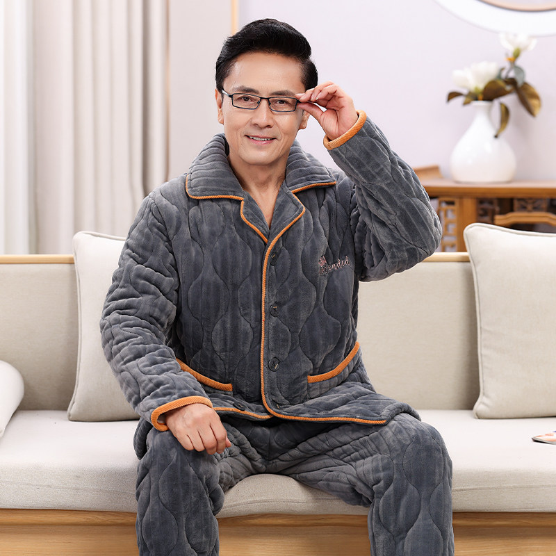 婷美珊瑚绒睡衣男士秋冬季加绒加厚三层夹棉冬款中老年家居服套装