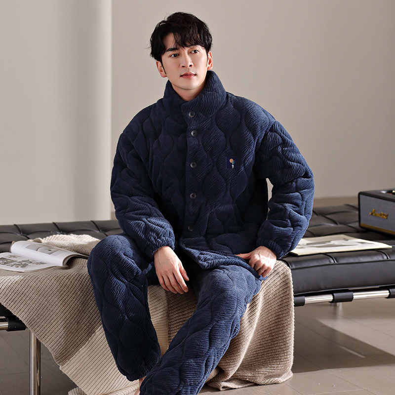 婷美高档睡衣男士冬季珊瑚绒加厚加绒保暖三层夹棉袄家居服秋冬款