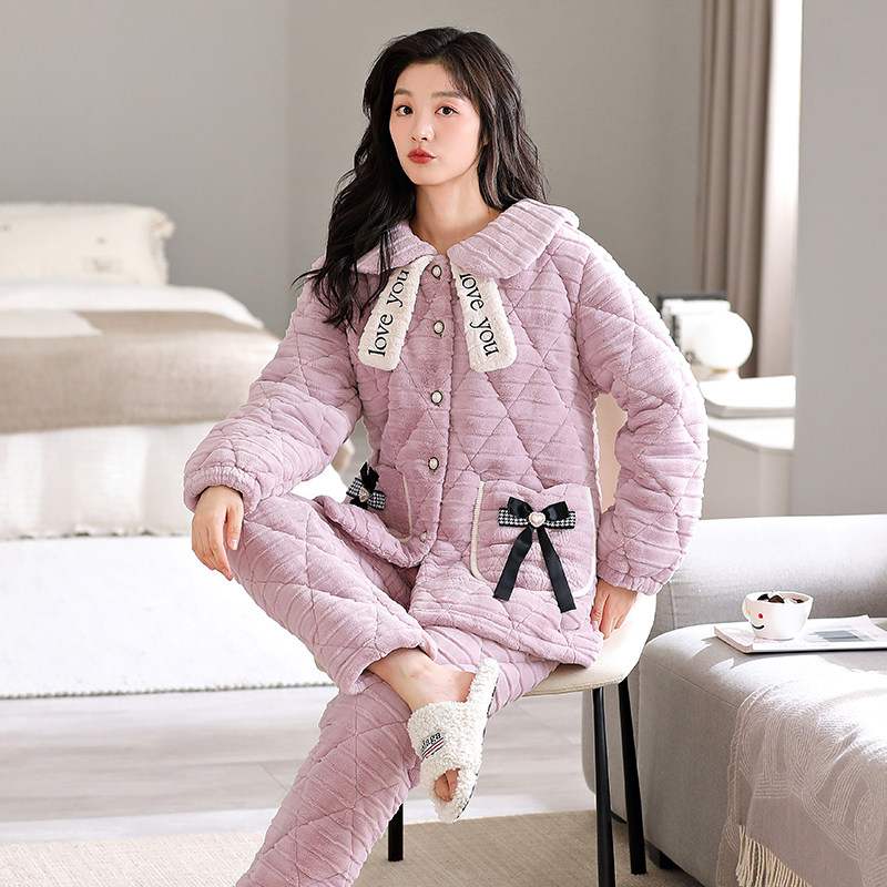 婷美冬季睡衣女珊瑚绒三层加厚夹棉甜美翻领家居服冬天棉袄两件套