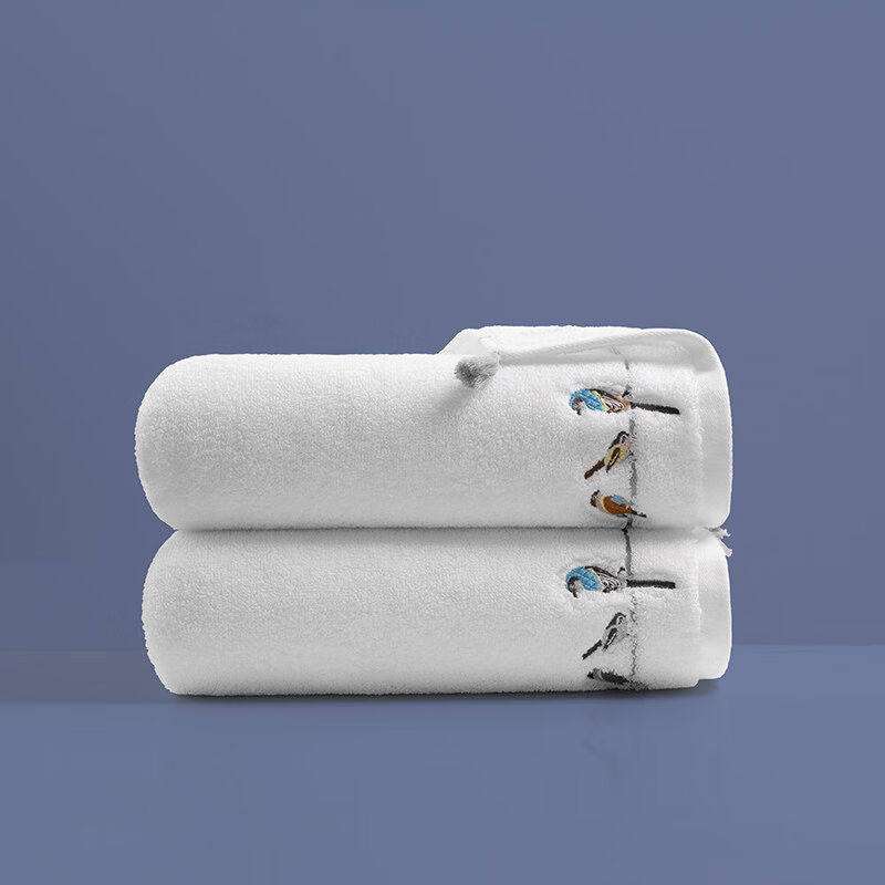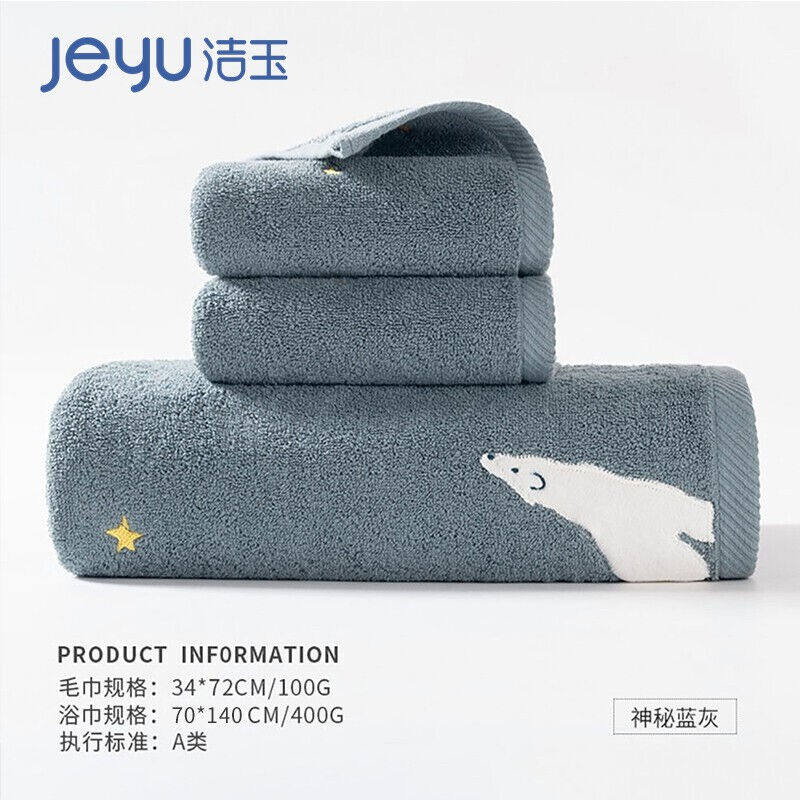 孚日洁玉毛浴套装纯棉男女加厚卡通刺绣浴巾三件套浴巾1毛巾2蓝灰
