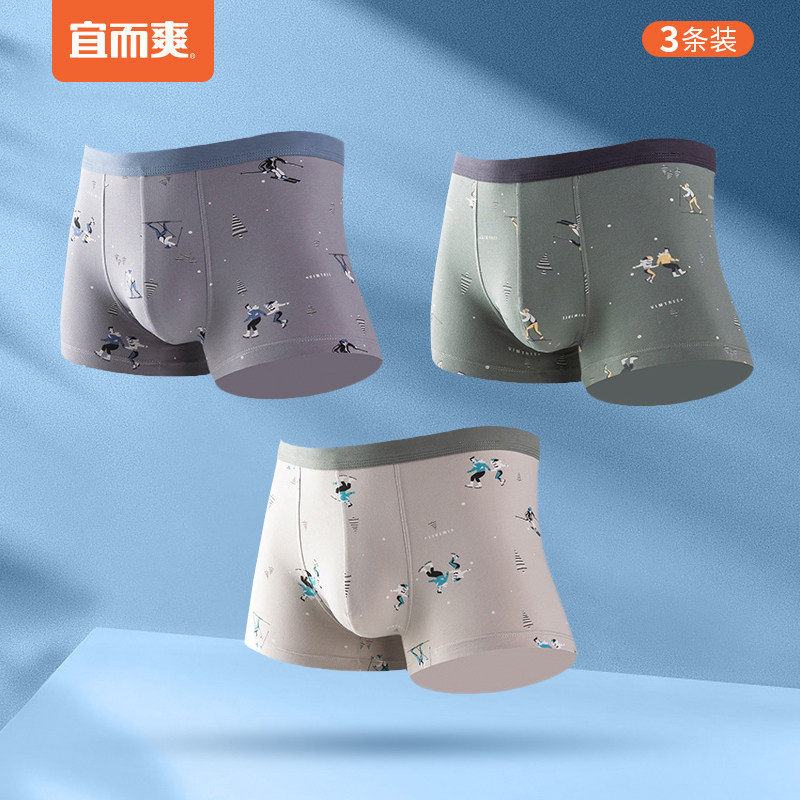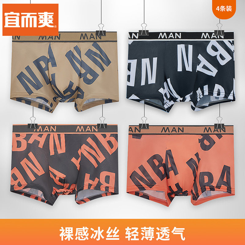 宜而爽内裤男冰丝印花青年个性潮流男士平角裤中腰透气四角短裤