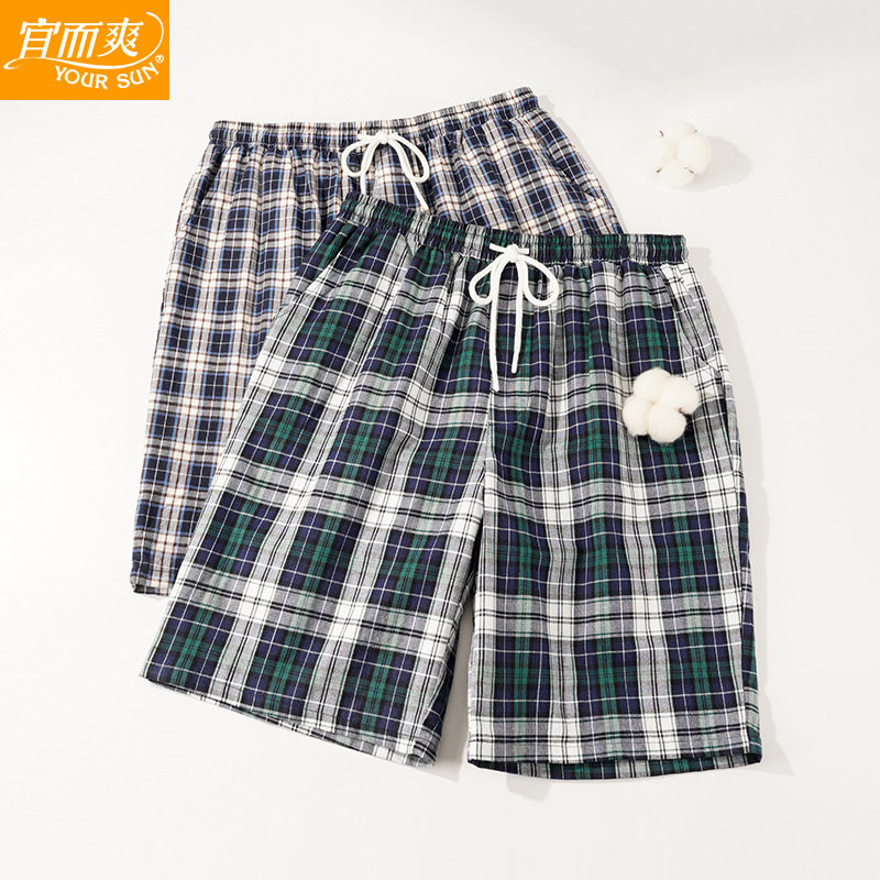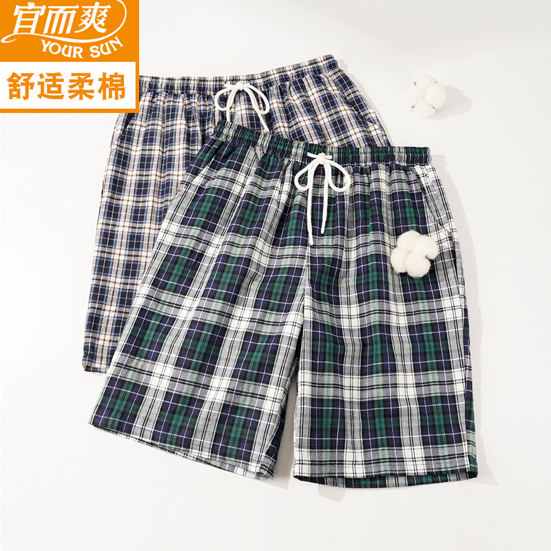宜而爽男士薄款透气休闲格子家居短裤中年宽松简约外穿五分沙滩裤