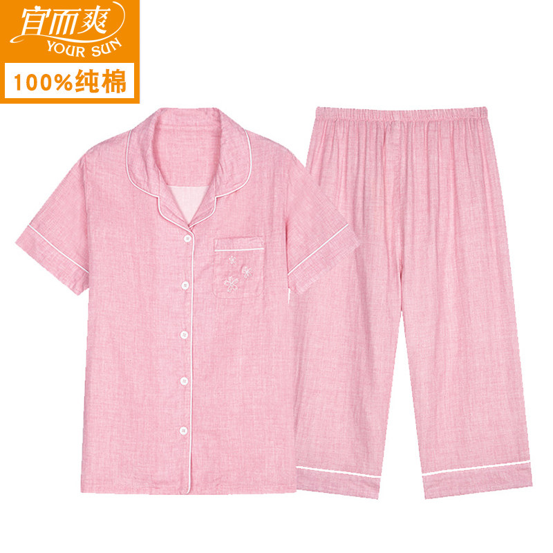 宜而爽家居服套装女士纯棉透气短袖短裤全棉绣花睡衣中老年宽松夏