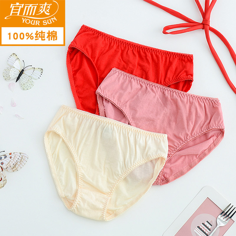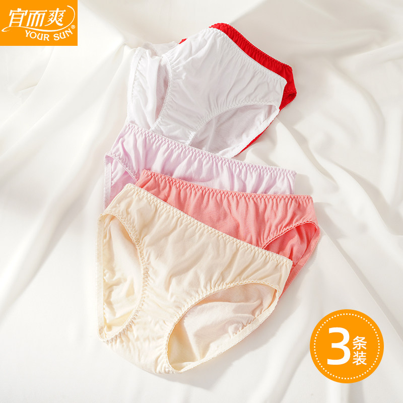 3条 宜而爽女士内裤纯棉中腰透气薄款三角裤全棉少女短裤头衩内衣