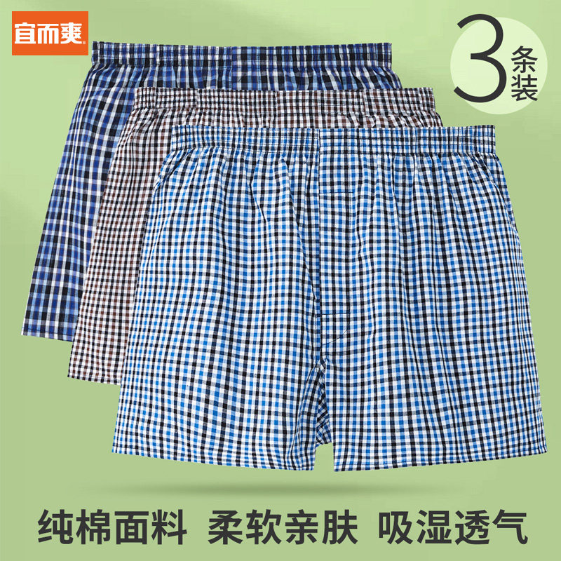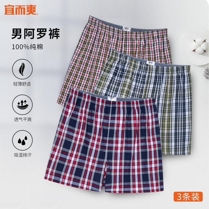 3条宜而爽男纯棉阿罗裤大码格子短裤全棉睡裤居家运动宽松平角裤