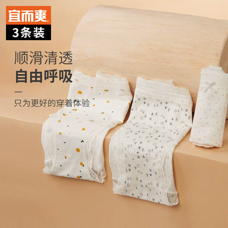 宜而爽内裤女纯棉氨印花低腰三角裤弹力透气抗菌少女蕾丝花边短裤