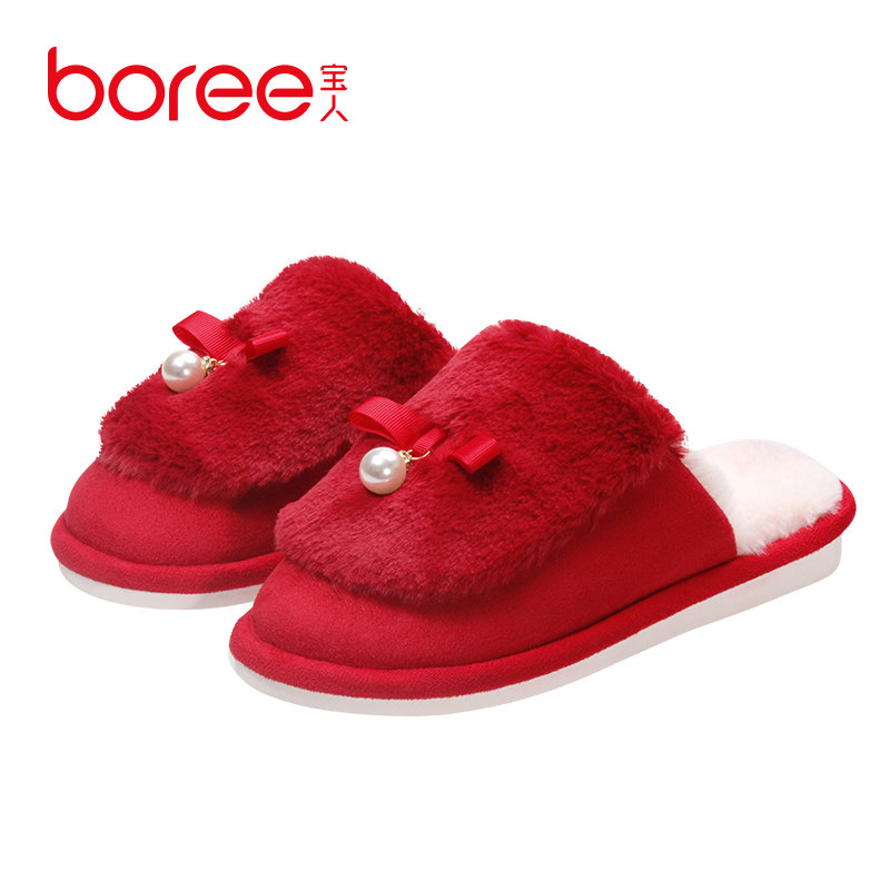 宝人棉拖鞋女士秋冬毛绒拖大红色轻便室内保暖居家棉拖女平底防滑