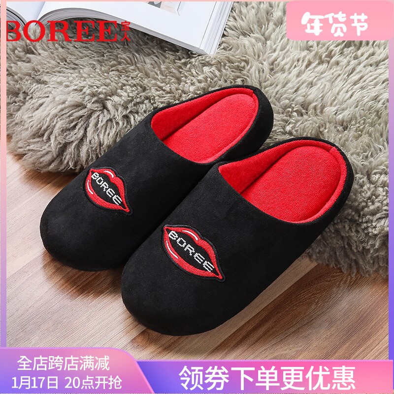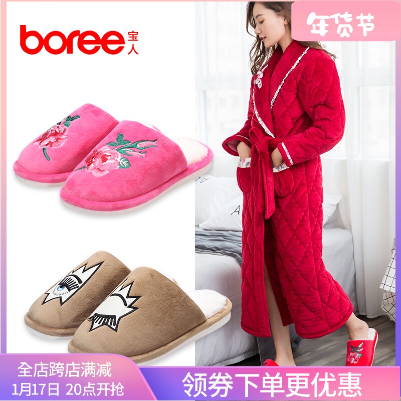宝人秋冬情侣棉拖家居家棉拖鞋室内防滑绣花毛绒保暖鞋男女棉鞋