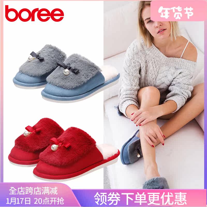 宝人女士保暖棉拖2023年冬季新款室内韩版毛毛拖鞋蝴蝶结防滑棉拖