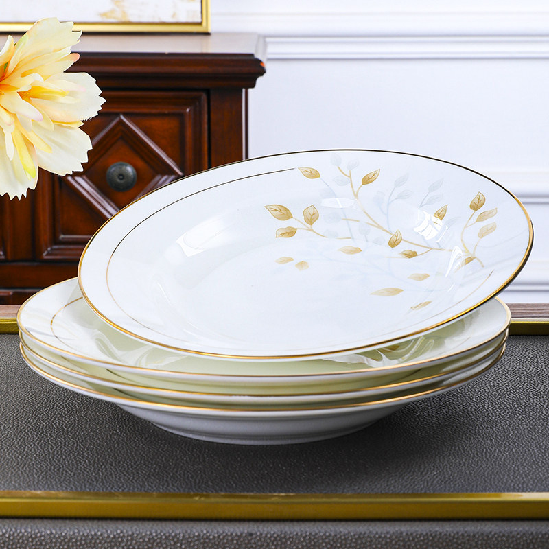 中式骨瓷家用炒菜盘子菜盘简约圆形汤盘深盘金边酒店创意陶瓷餐具
