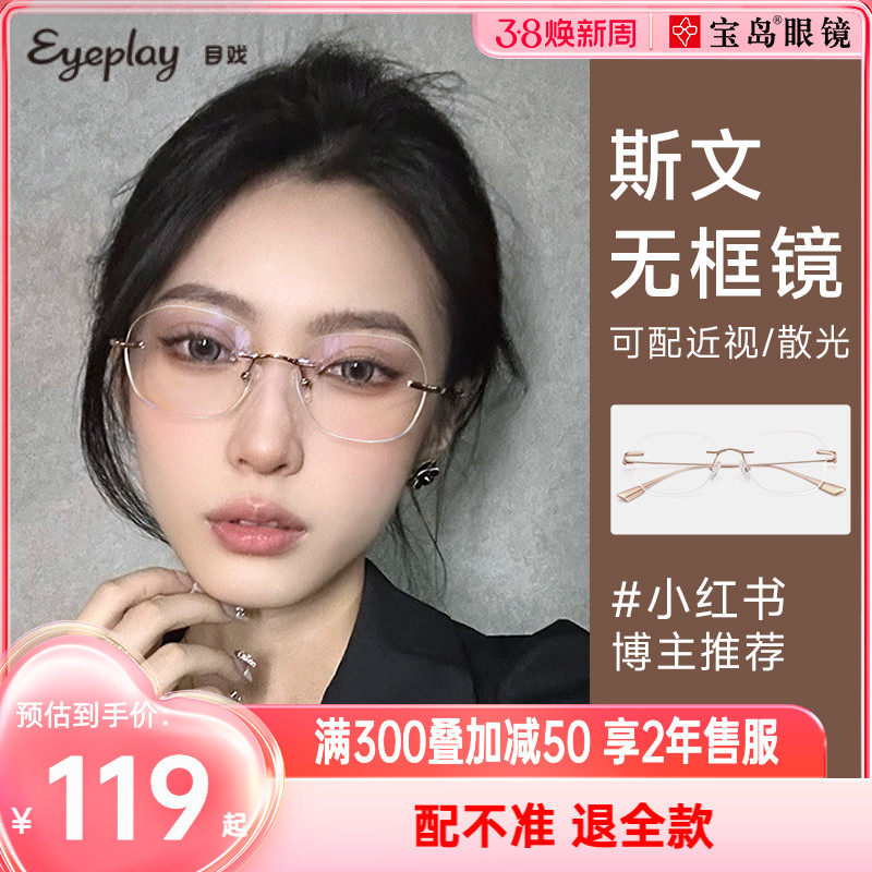 目戏斯文无边框近视眼镜女可配度数无框眼镜框镜架防蓝光镜片宝岛