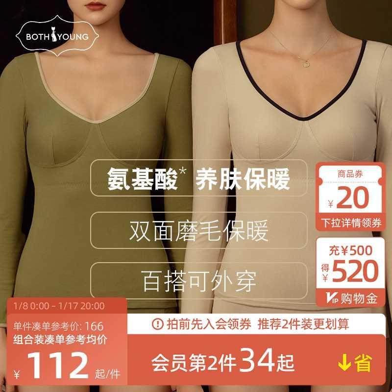 宝诗嫣德绒保暖内衣女士冬加绒加厚自发热秋衣打底带胸垫肌底上衣