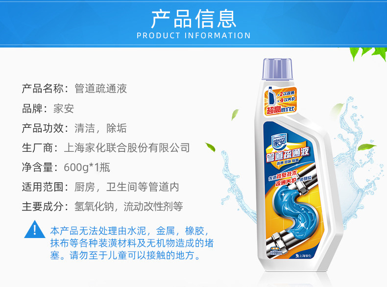 上海家化家安管道疏通剂1瓶卫生间厕所堵塞强力通下水道清洁除菌