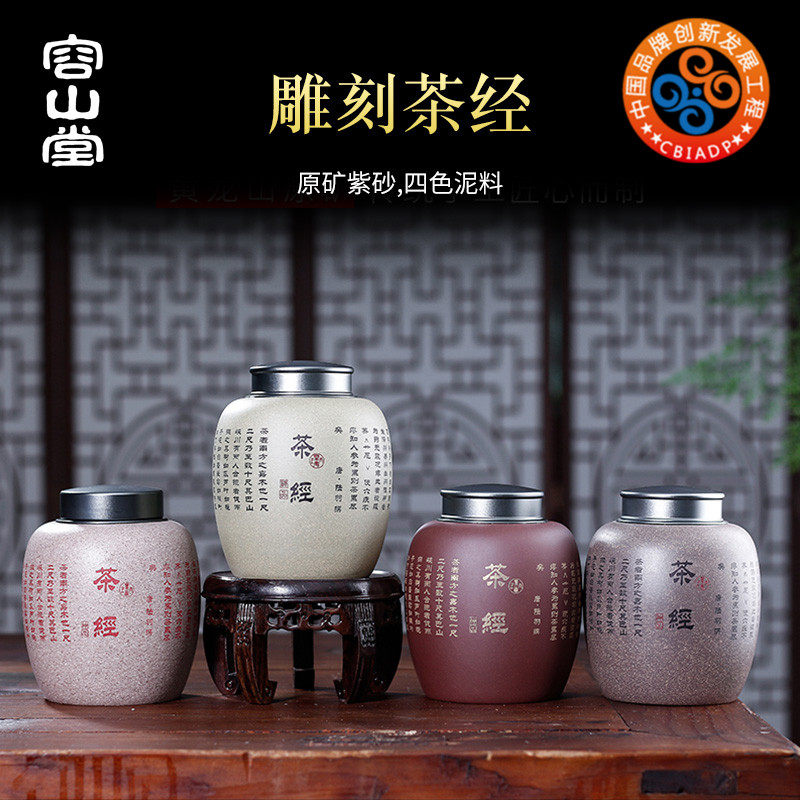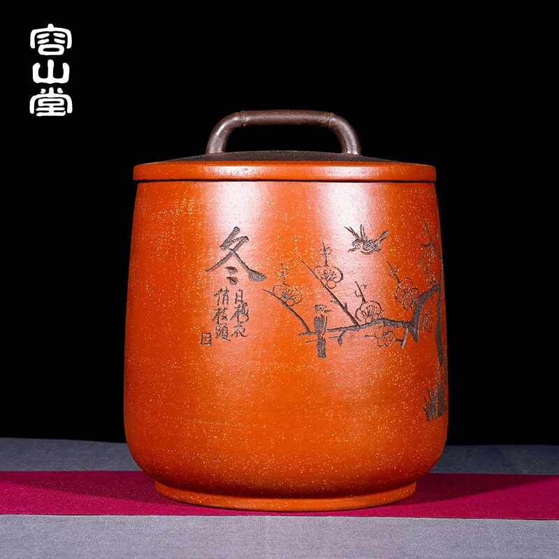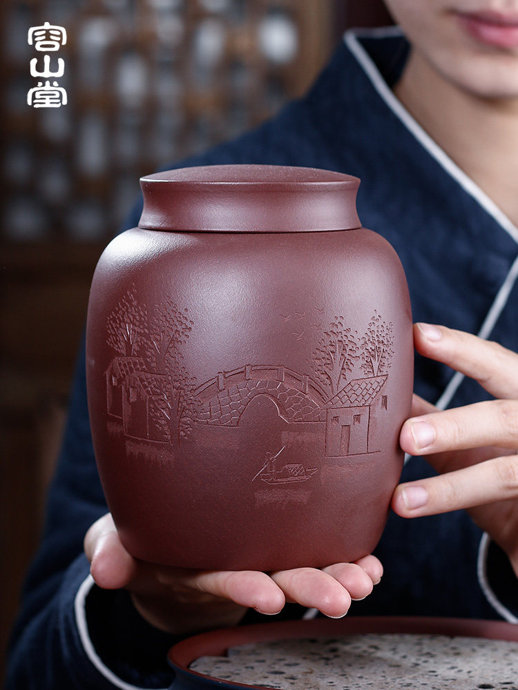 定制容山堂原矿紫砂茶叶罐手工刻绘密封防潮中式家用储茶醒茶散茶