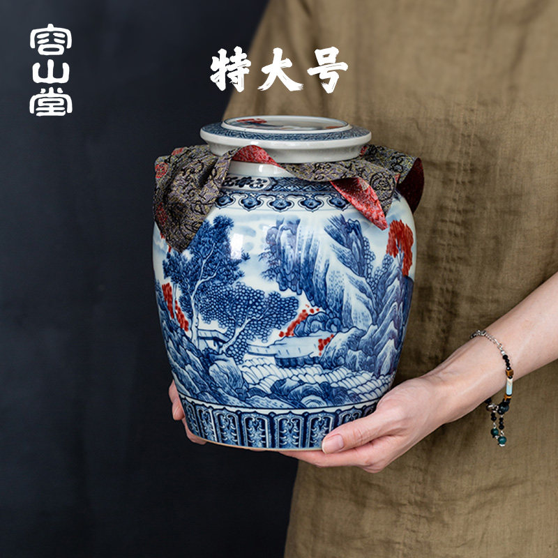 容山堂古脂陶瓷茶叶罐密封罐青花彩绘普洱储茶缸大号储物罐摆件