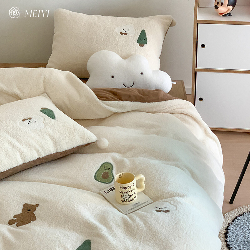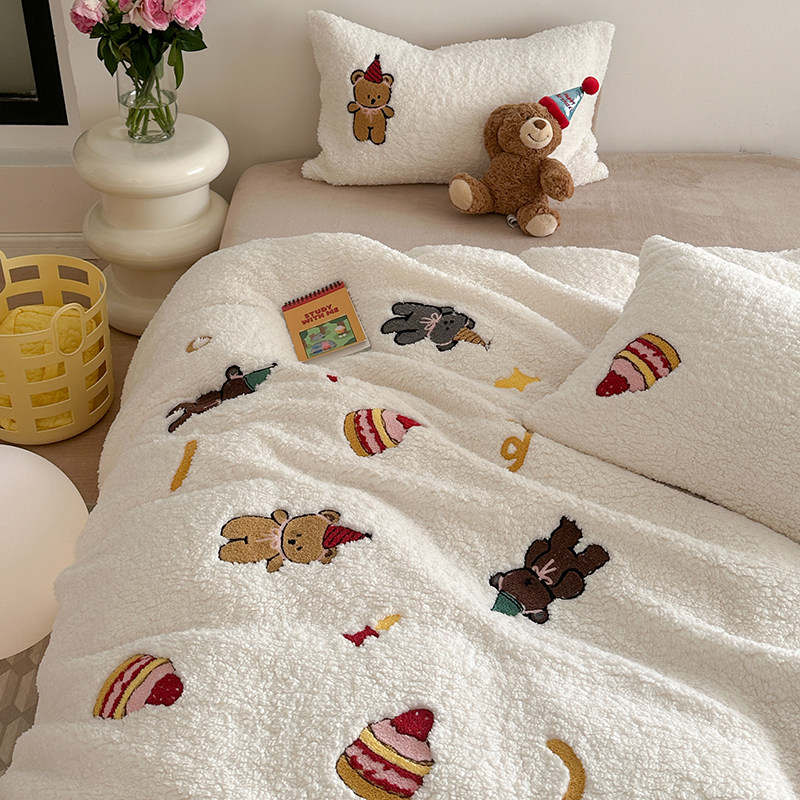 卡通风秋冬加厚绵羊绒四件套可爱小熊刺绣被套保暖牛奶绒床上用品