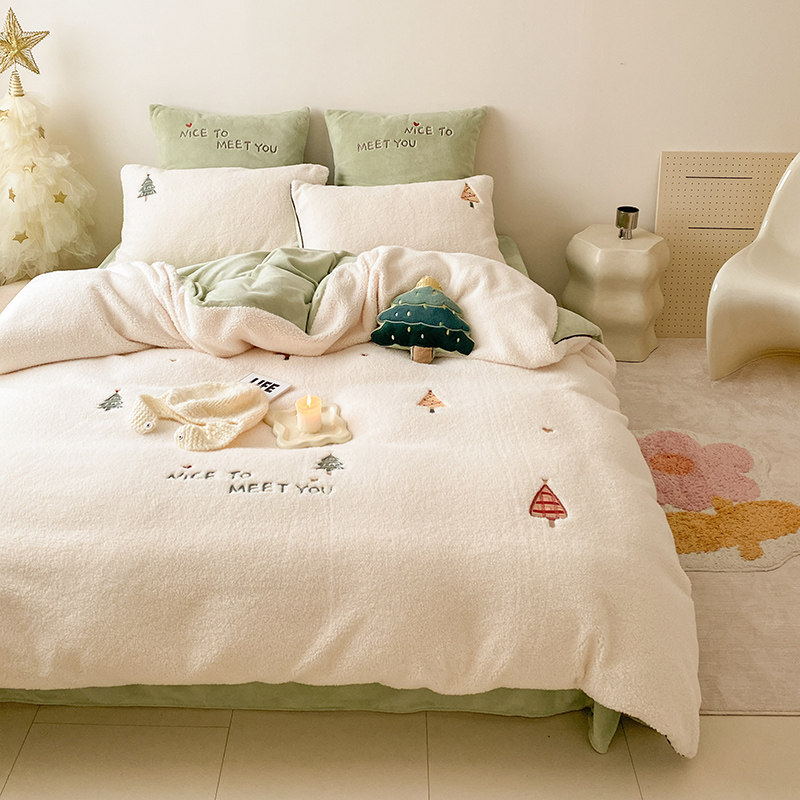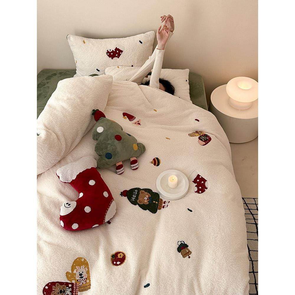 圣诞A类绵羊绒牛奶绒四件套冬季小清新刺绣加绒加厚被套床上用品