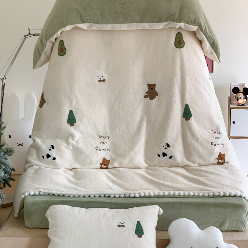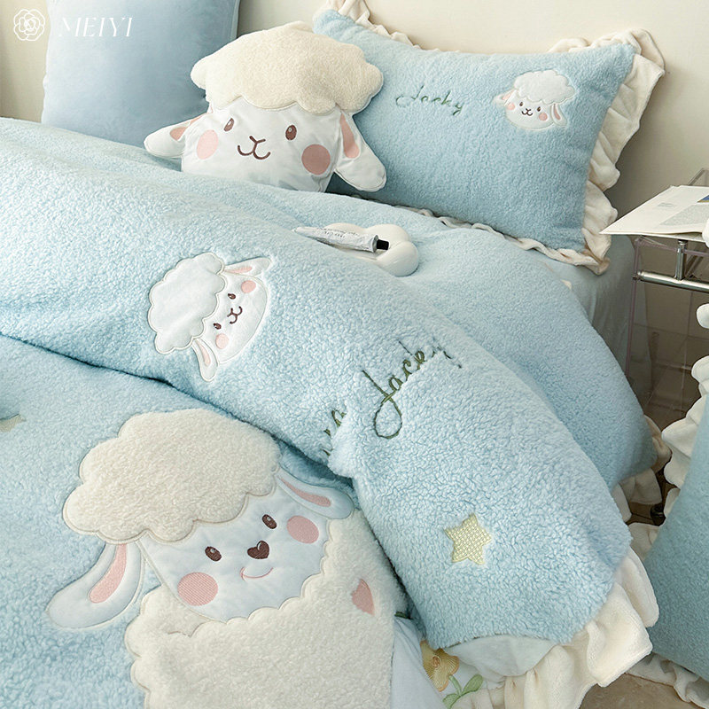 新款绵羊绒牛奶绒刺绣冬款加厚双面保暖珊瑚绒卡通床上用品小清新