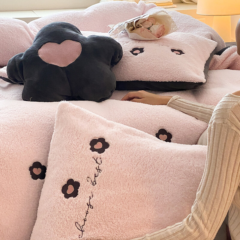少女心秋冬加厚绵羊绒四件套爱心刺绣拼色被套保暖牛奶绒床上用品