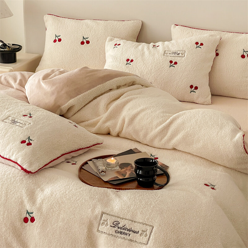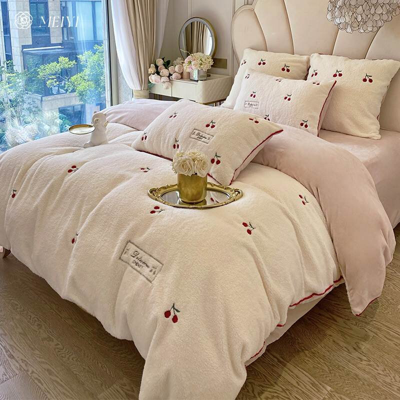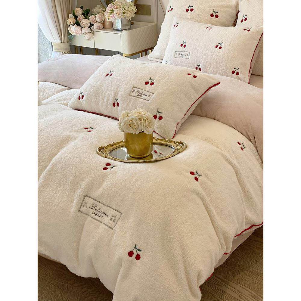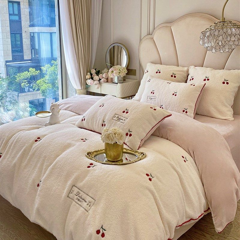 ins风少女心小樱桃绵羊绒四件套保暖刺绣甜美韩式牛奶绒床上用品