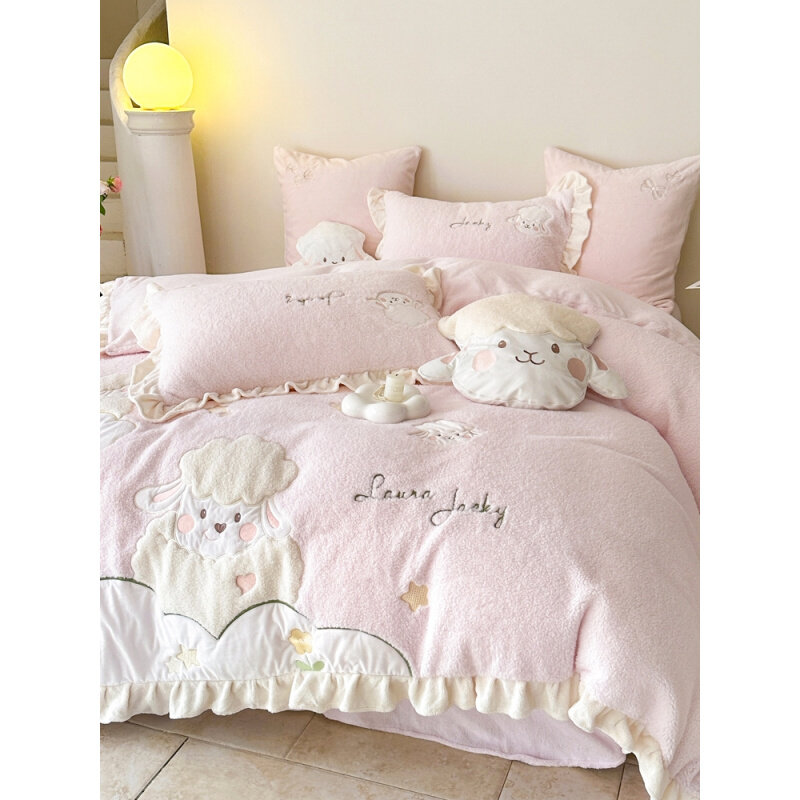卡通风秋冬加厚绵羊绒四件套可爱刺绣毛球被套保暖牛奶绒床上用品