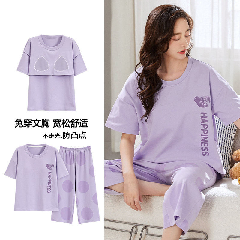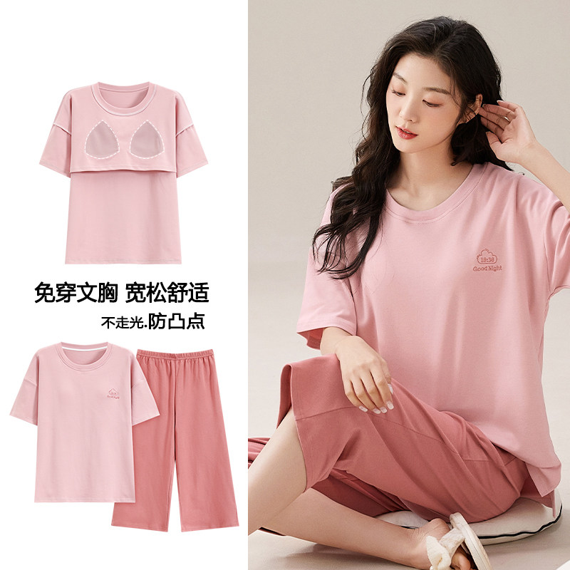 浪莎带胸垫睡衣女夏季纯棉短袖七分裤可外穿休闲甜美家居服两件套