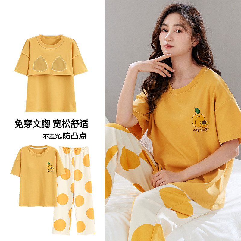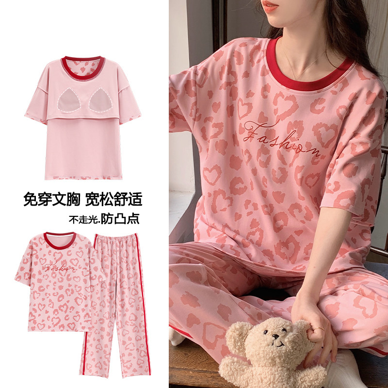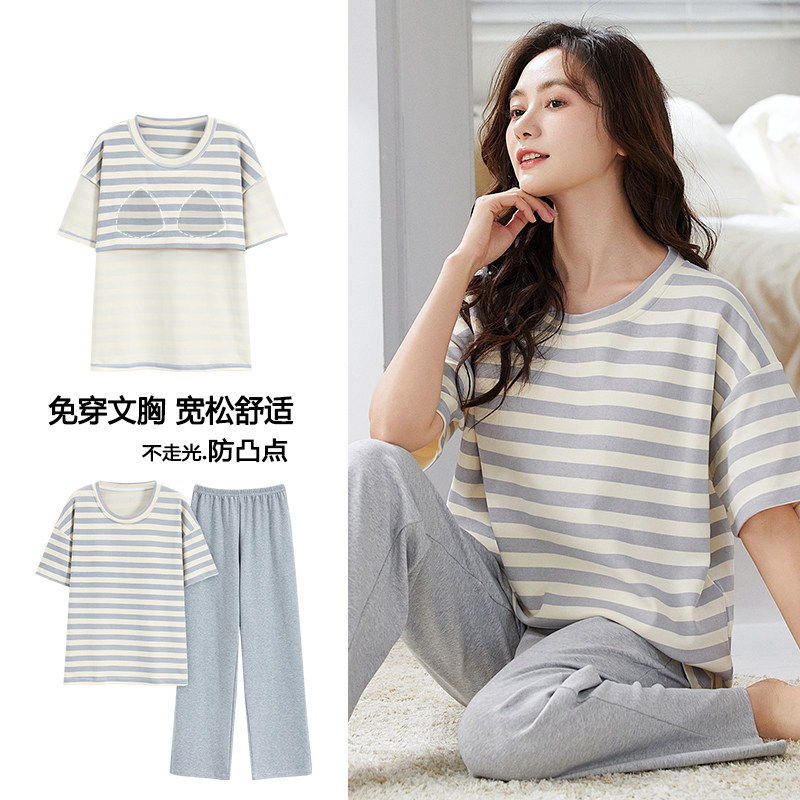 浪莎带胸垫睡衣女夏季薄款纯棉短袖长裤休闲宽松可外穿家居服套装