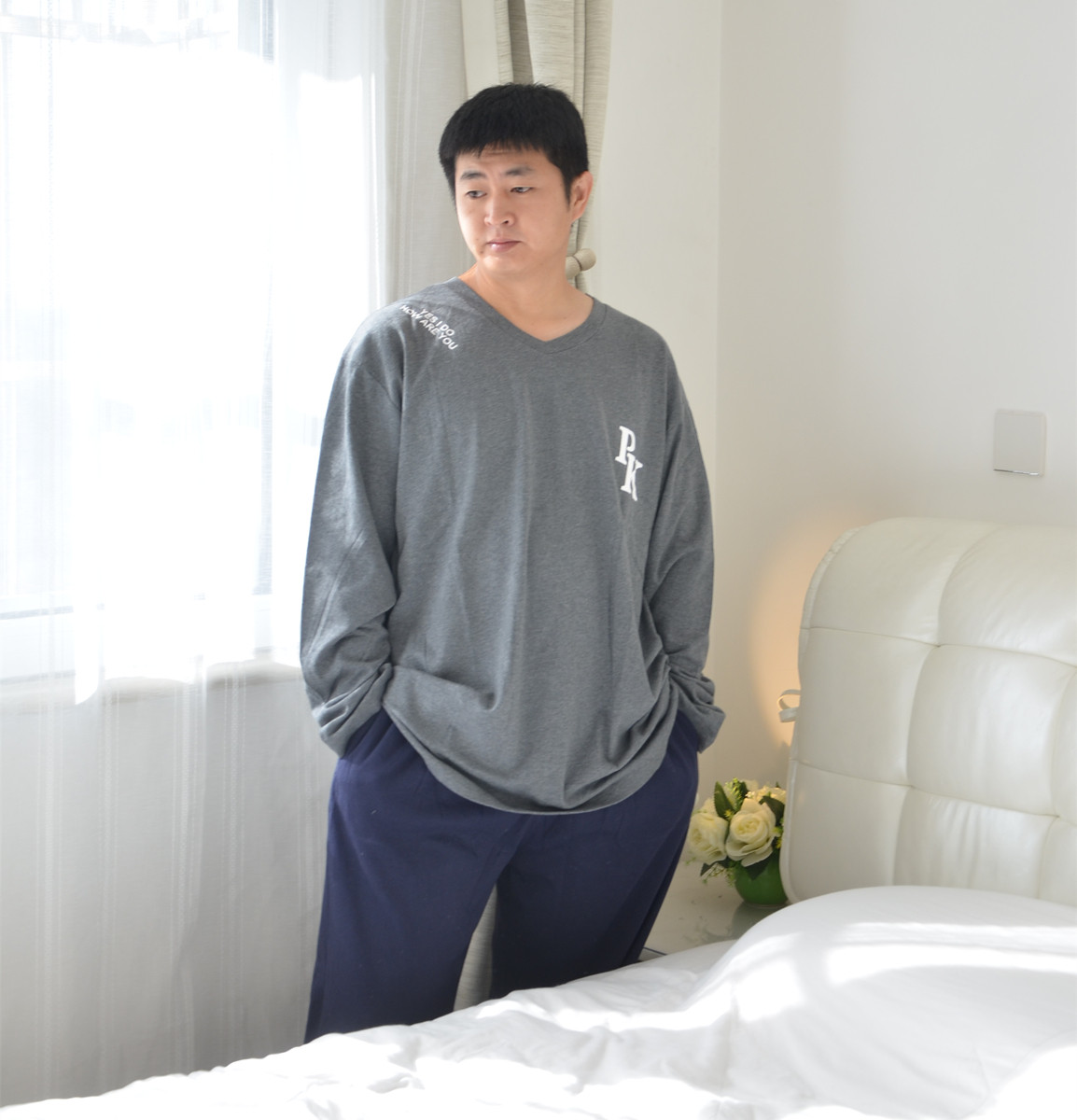 300斤加肥加大码V领加厚纯棉睡衣男春秋长袖长裤休闲家居服可外穿