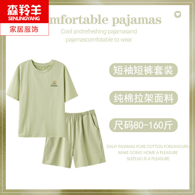 夏季女士休闲短袖短裤纯棉睡衣中年妈妈夏天薄款胖MM家居服可外穿