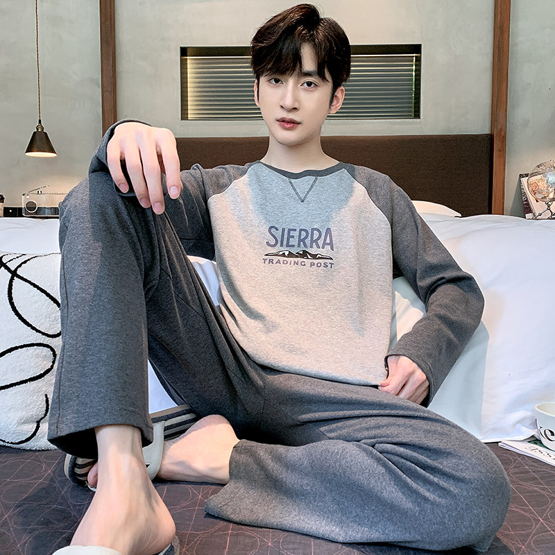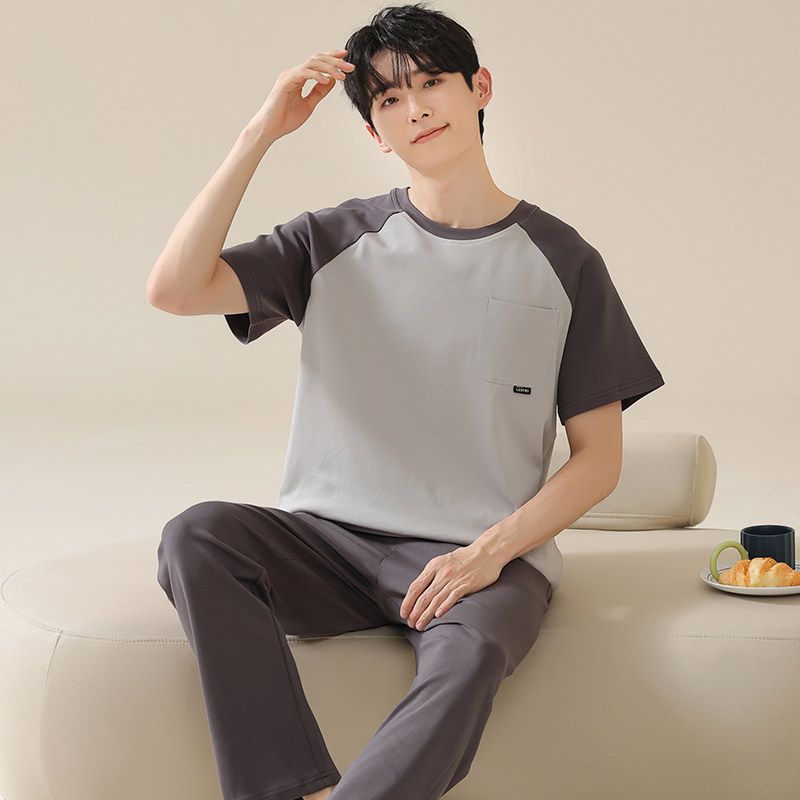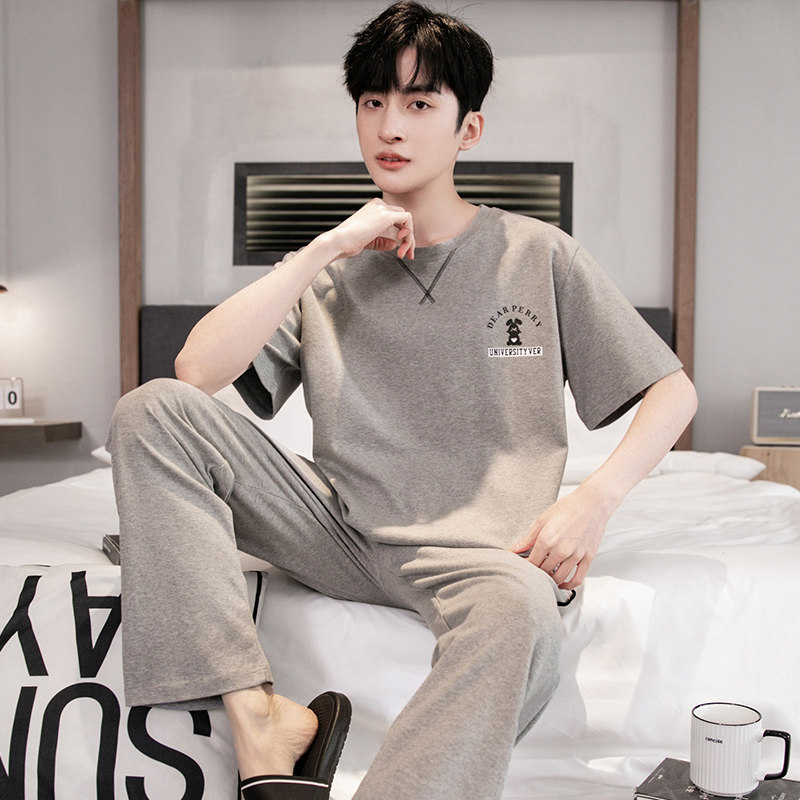 男士睡衣纯色夏季纯棉薄款短袖长裤春秋青年时尚休闲可外穿家居服