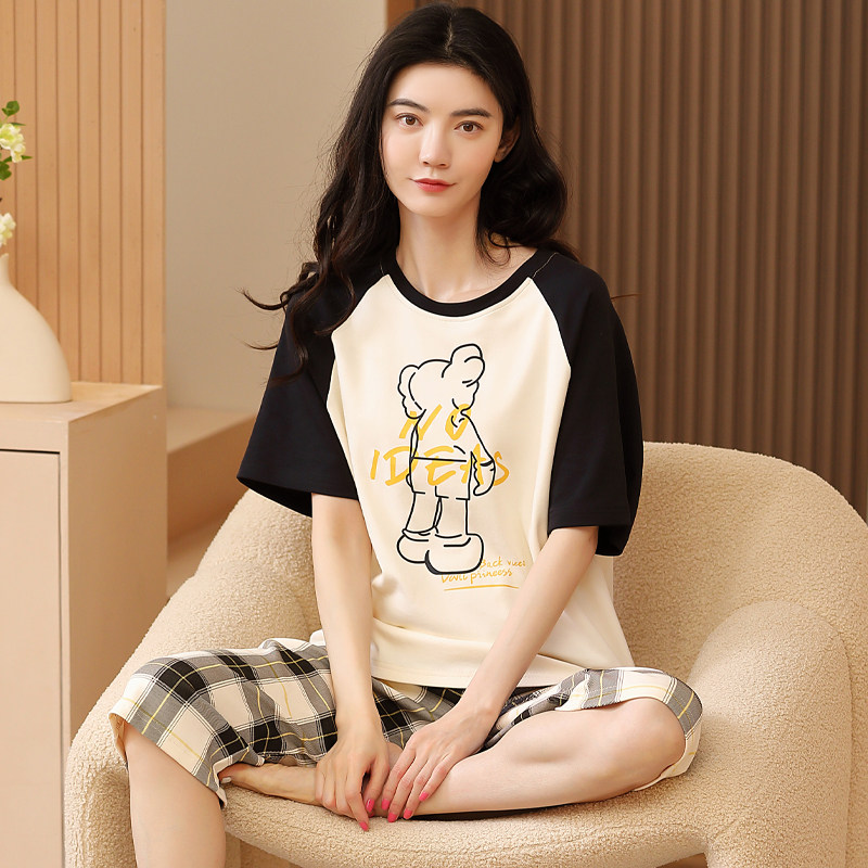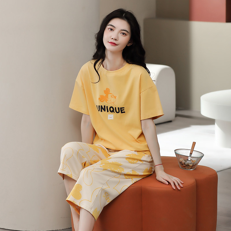 可出门睡衣女士夏季薄款套装短袖纯棉七分裤休闲宽松家居服两件套