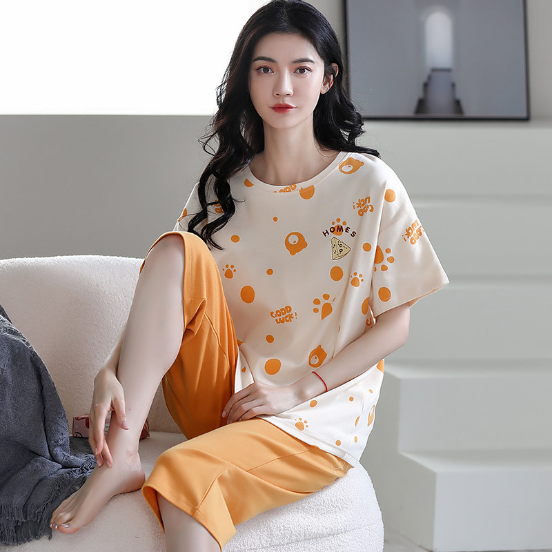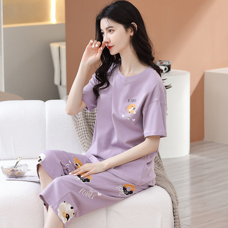 睡衣女夏季纯棉短袖七分裤休闲宽松女士夏天可外穿中裤家居服套装