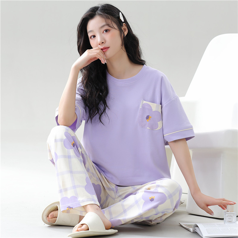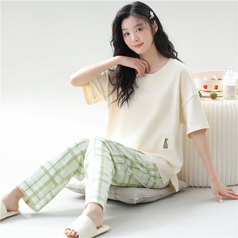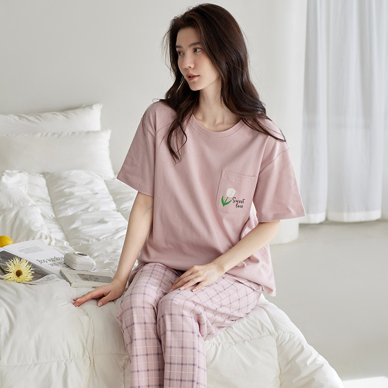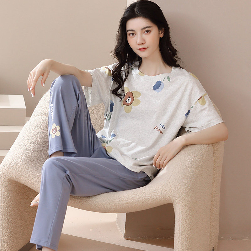 睡衣女士春秋纯棉短袖长裤家居服夏天全棉薄款休闲可出门外穿套装