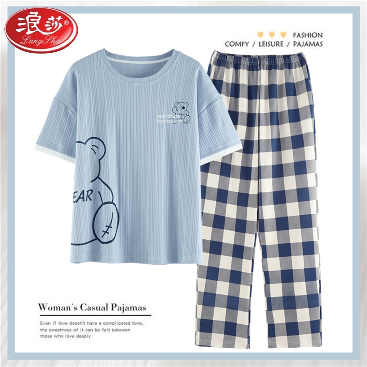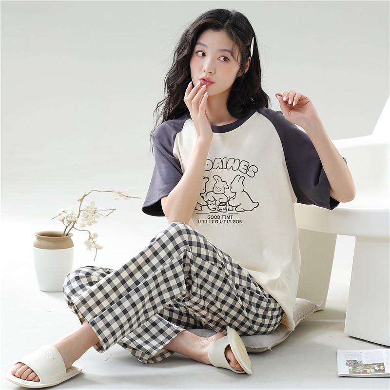 运动款睡衣女夏季短袖时尚休闲七分裤可外穿全棉家居服薄款夏套装