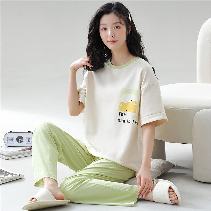 短袖长裤睡衣女夏季纯棉薄款可爱卡通休闲可外穿家居服2024年新款