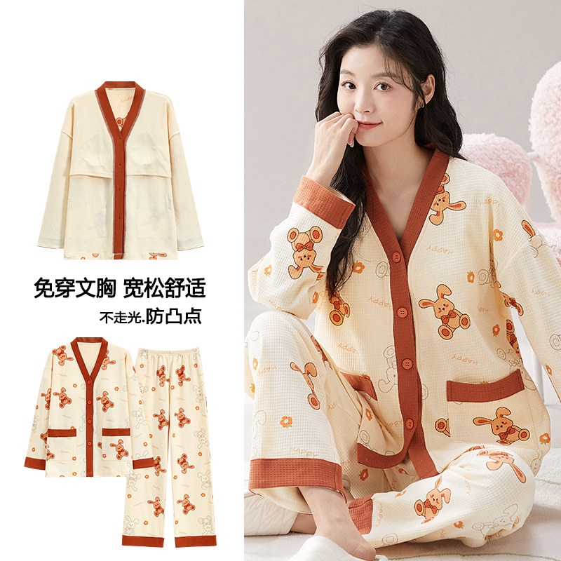 浪莎自带胸垫睡衣女春秋季纯棉长袖长裤可外穿休闲家居服两件套装