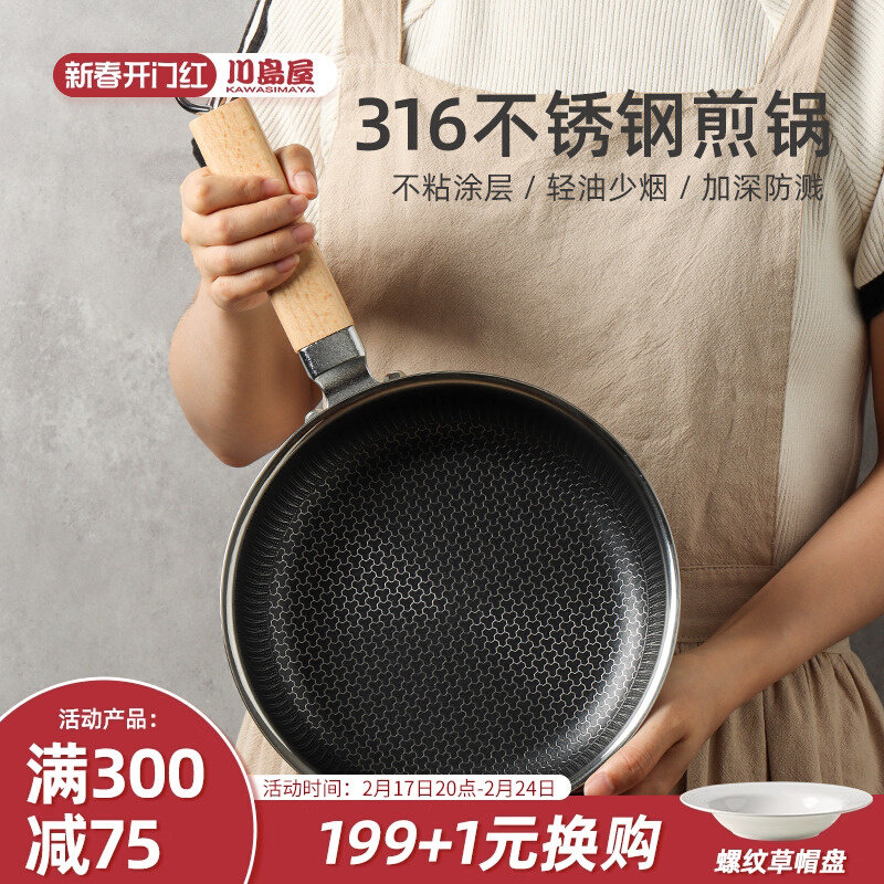 川岛屋不锈钢平底锅家用不粘炒菜锅电磁炉燃气灶专用炒锅煎蛋煎锅