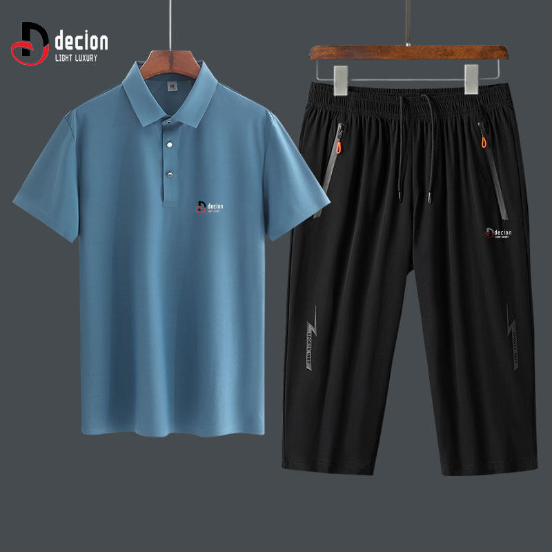 帝客堡冰丝高弹运动套装男士夏季polo衫短袖短裤宽松七分裤两件套