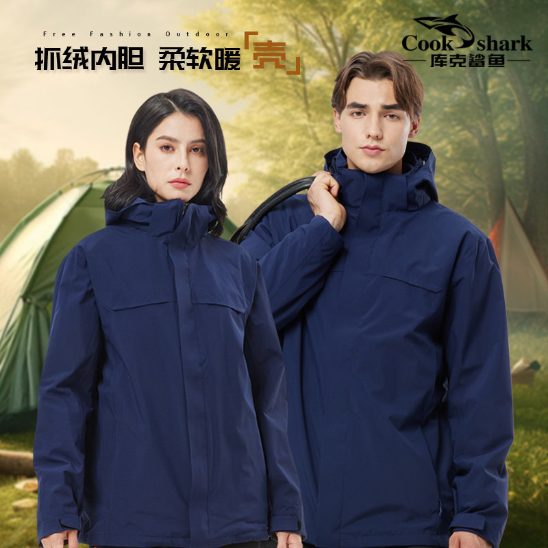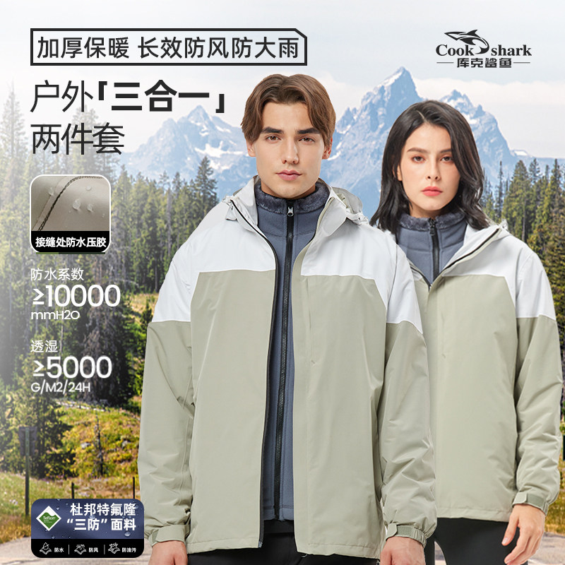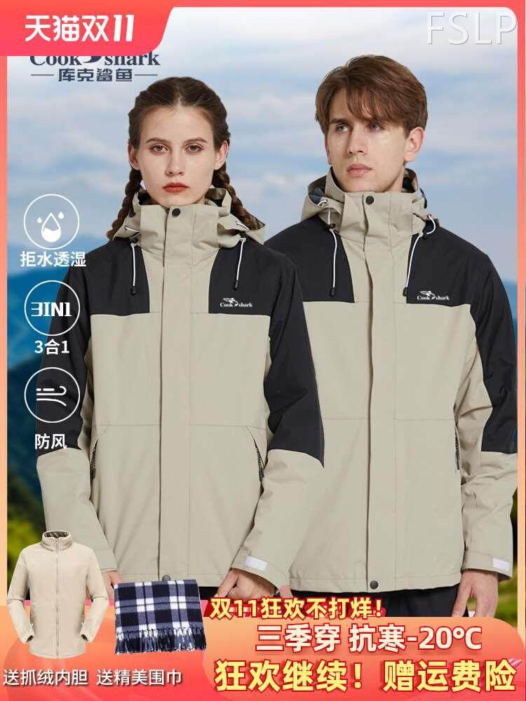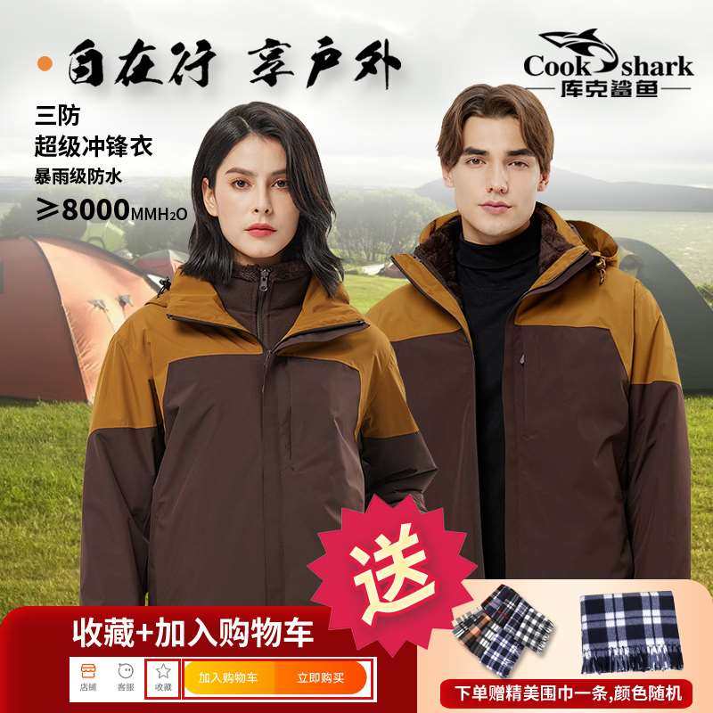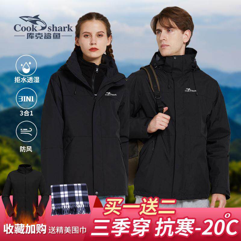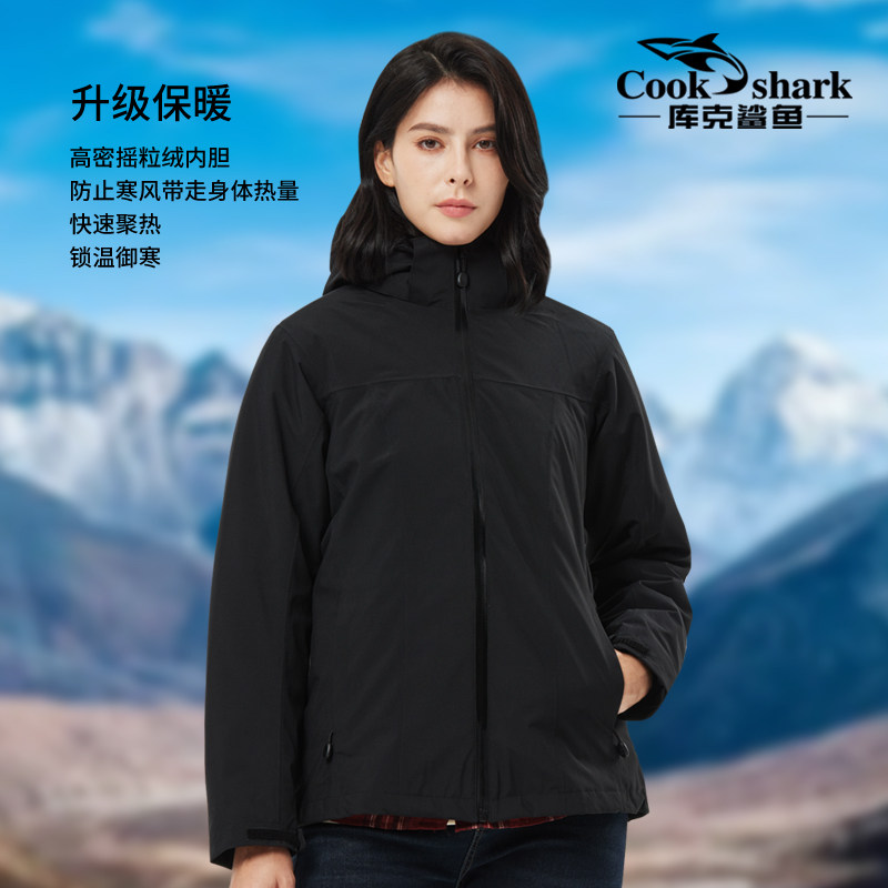 库克鲨鱼户外三合一男女款冲锋加绒内胆冬季抗寒防水防风外套衣服