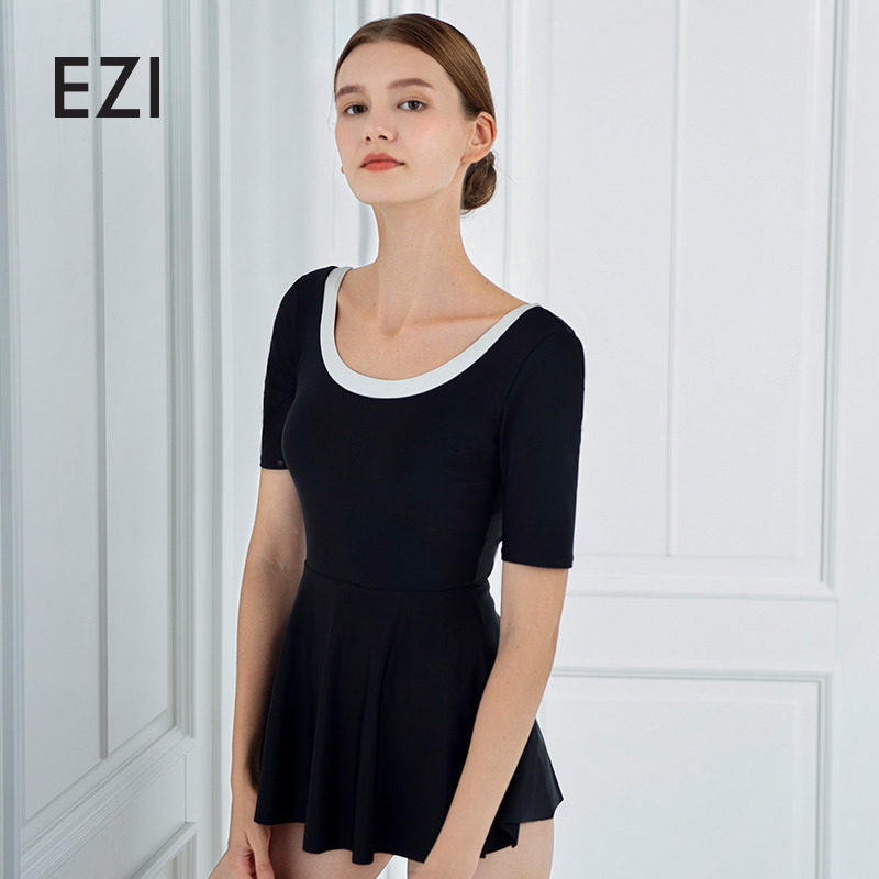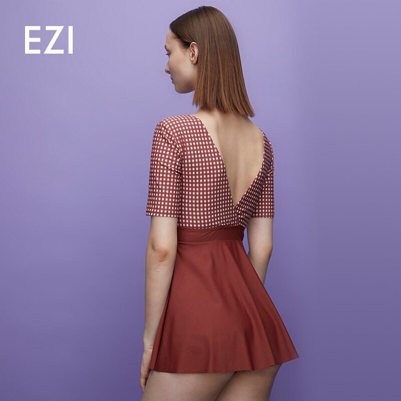 弈姿新款连体平角短袖泳衣女夏保守遮肚显瘦泡温泉度假防晒游泳衣