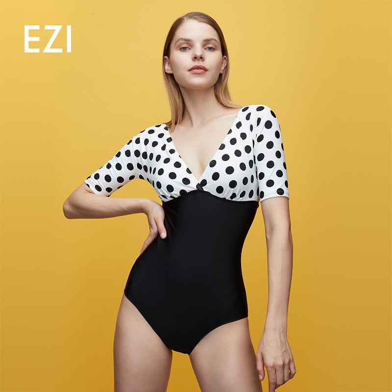 弈姿连体泳衣女ins风度假显瘦修身露背波点中袖性感三角泡温泉