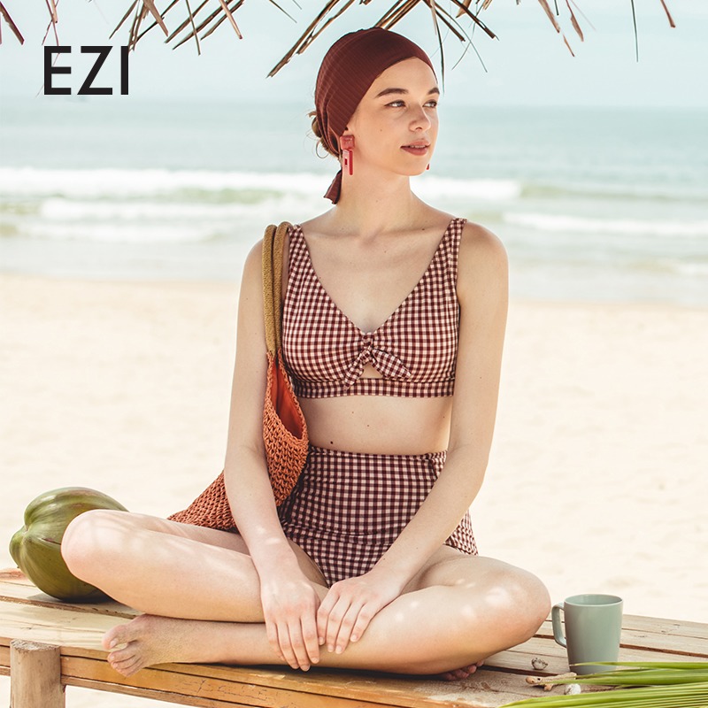 弈姿新款泳衣女 甜美ins风格子分体游泳衣性感bikini显瘦泳装