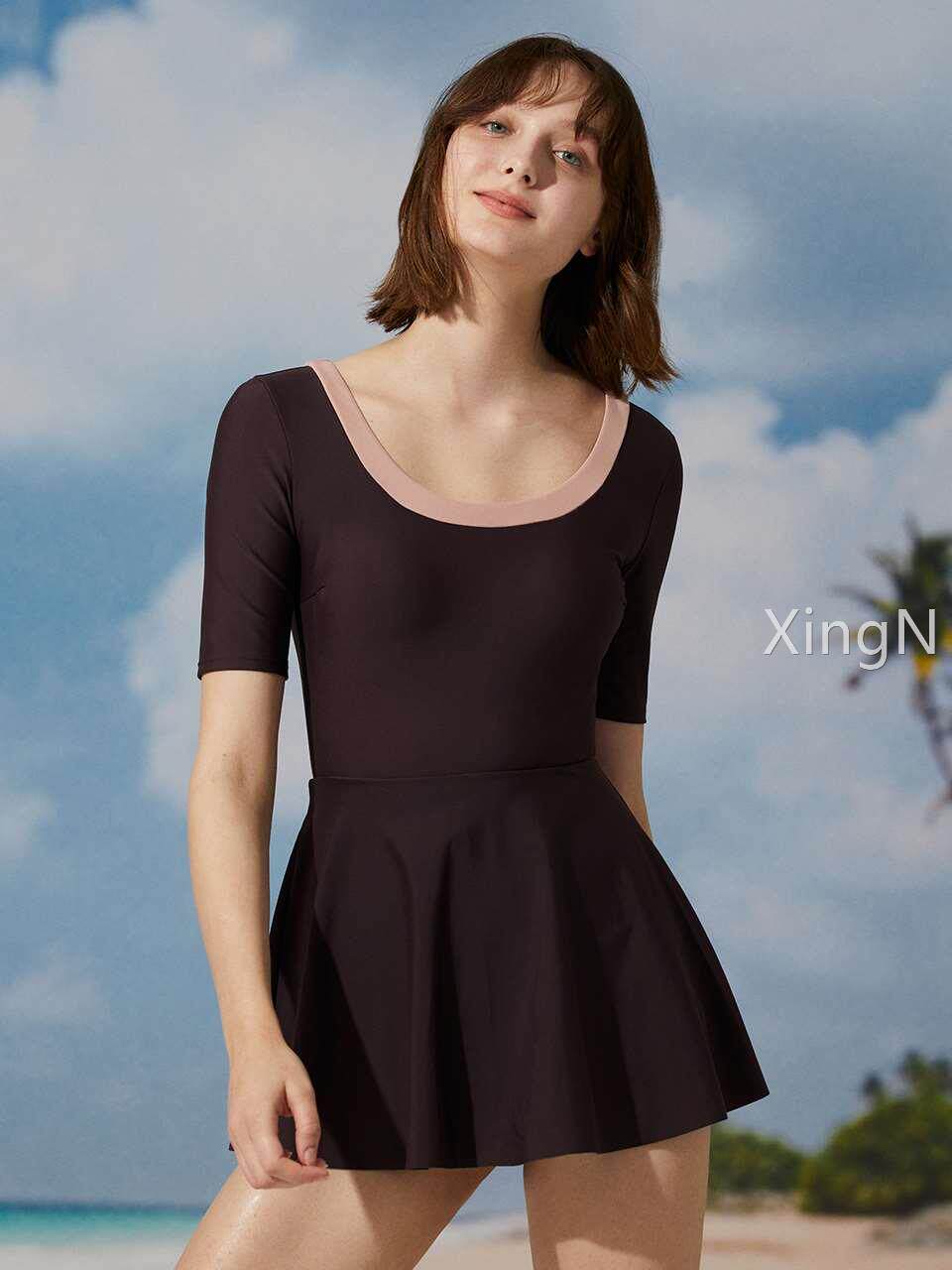 弈姿新款连体裙式泳衣女夏保守遮肚显瘦泡温泉度假防晒大码游泳衣