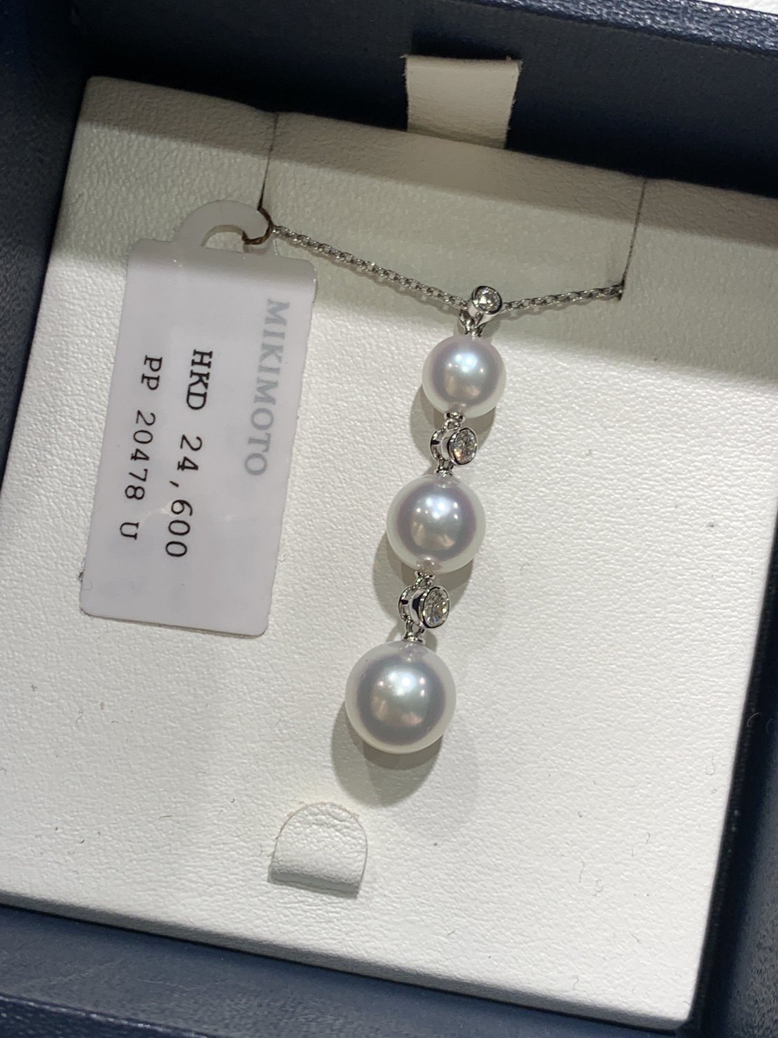 香港MIKIMOTO御木本18K白金钻石海水珍珠3颗珠吊坠女生项链