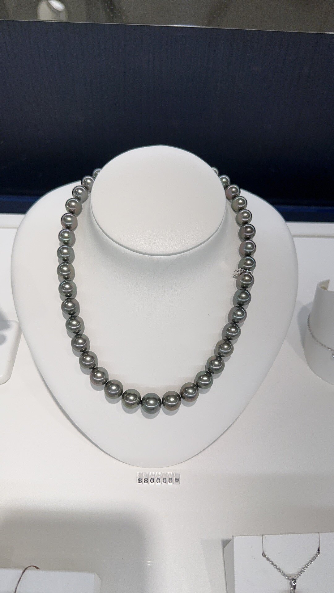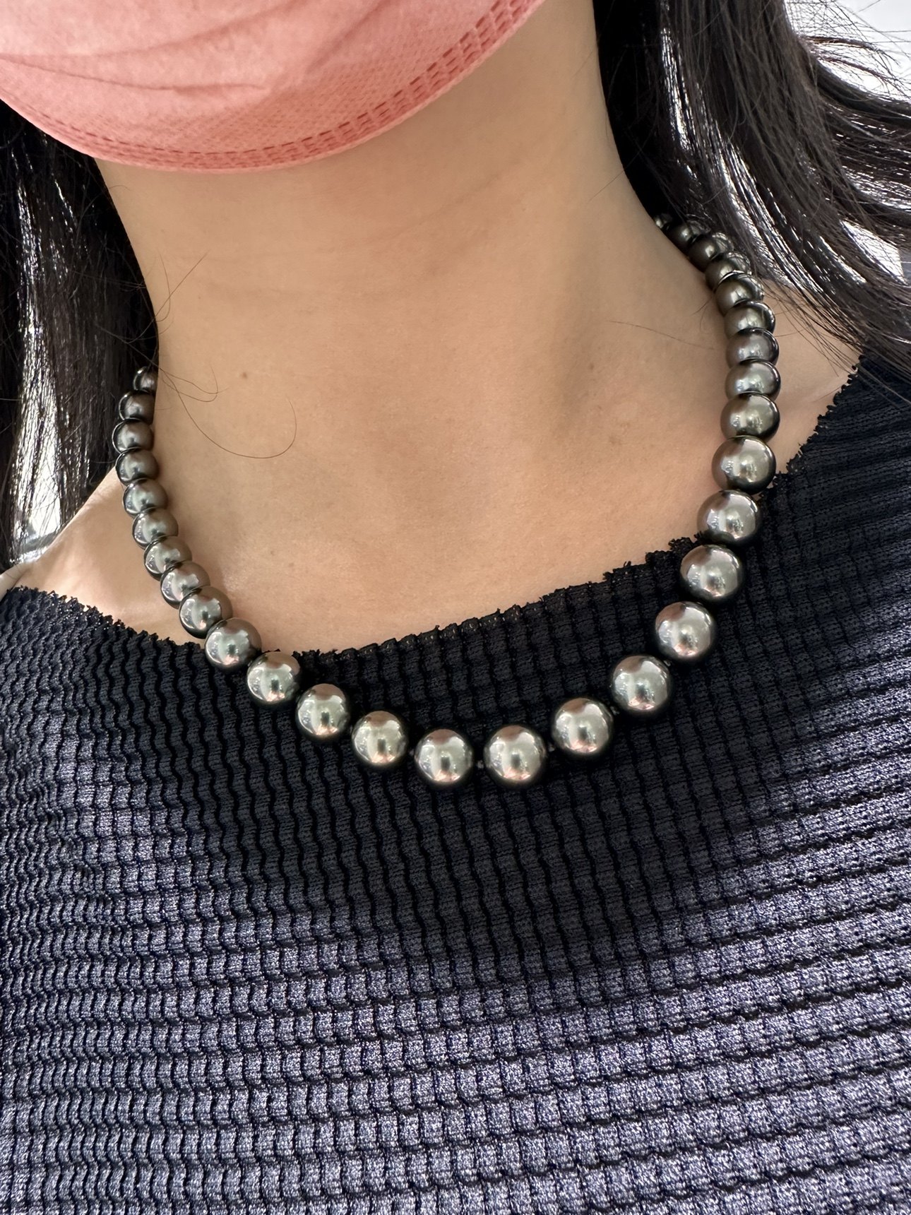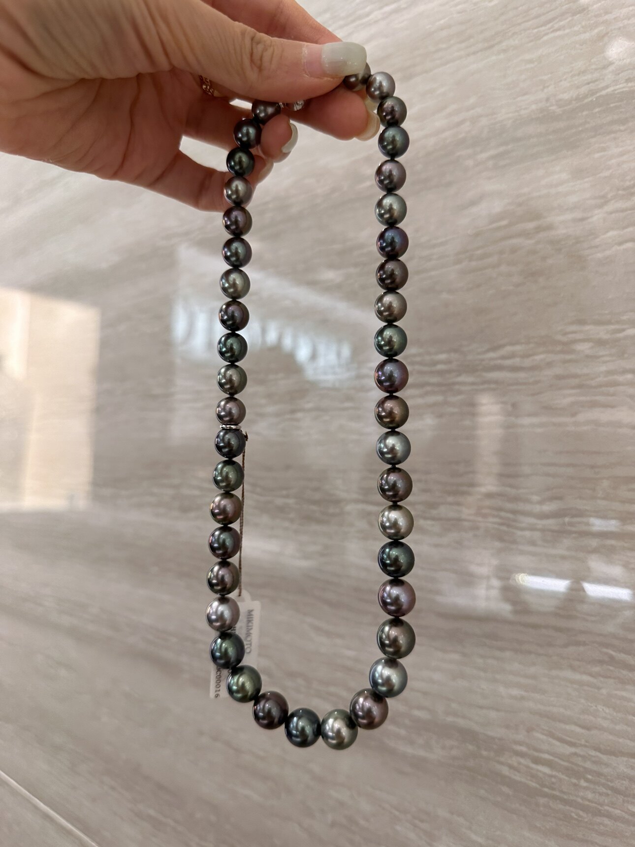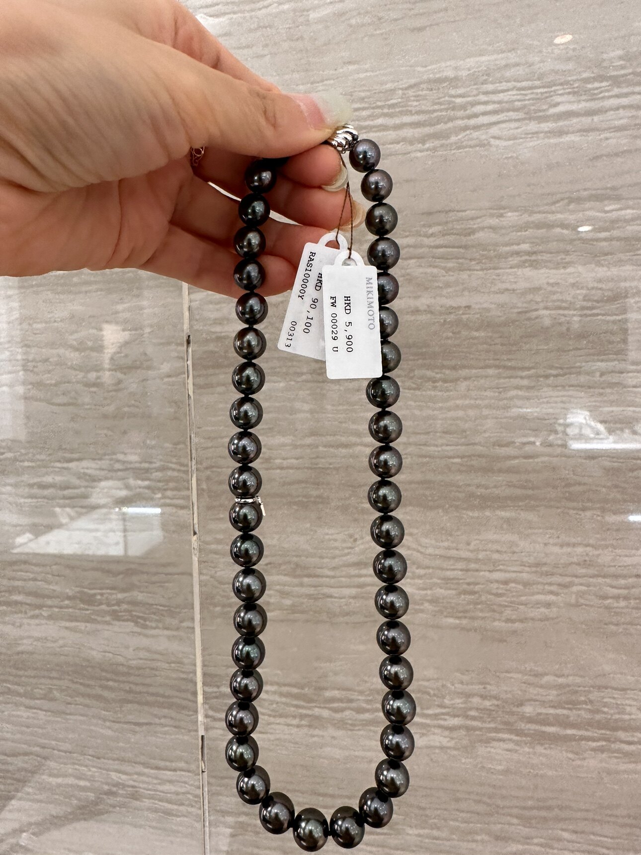 香港MIKIMOTO御木本18k白金扣一串大溪地极黑亮珍珠项链9-10.9mm